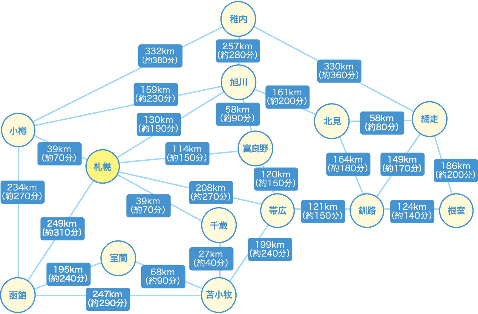 北海道内のアクセス都市間の距離と移動の目安
